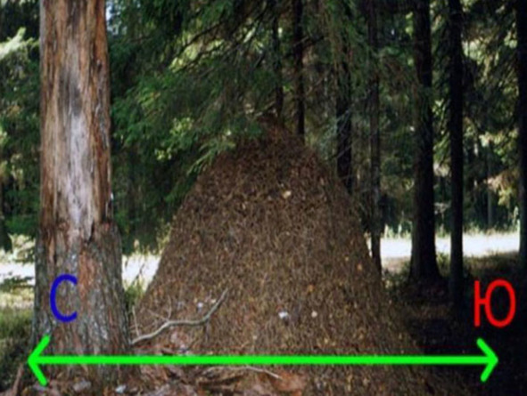 С севера муравейники обычно чем-нибудь защищены (стволом дерева, кустом, камнем), их северная сторона более крутая.