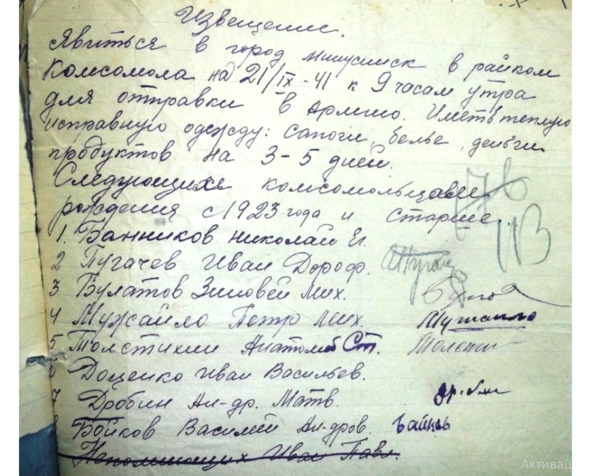 Из воспоминаний Белокопытовой В. М.: «О начале войны в селе узнали на третий день. Весть эта страшной змеей ползла по улице. Из домов выбегали дети, взрослые, старики, подростки и в смятении бежали, шли к колхозной конторе. В деревне в ту пору было много молодежи. Было мне в ту пору всего лишь четырнадцать лет. Мужчины хорошо понимали, что надо собираться. И, когда вручали повестки, они уже были готовы идти воевать. Я на всю жизнь запомнила лица этих красивых необыкновенных молодых людей, из которых почти никто не вернулся с фронта.