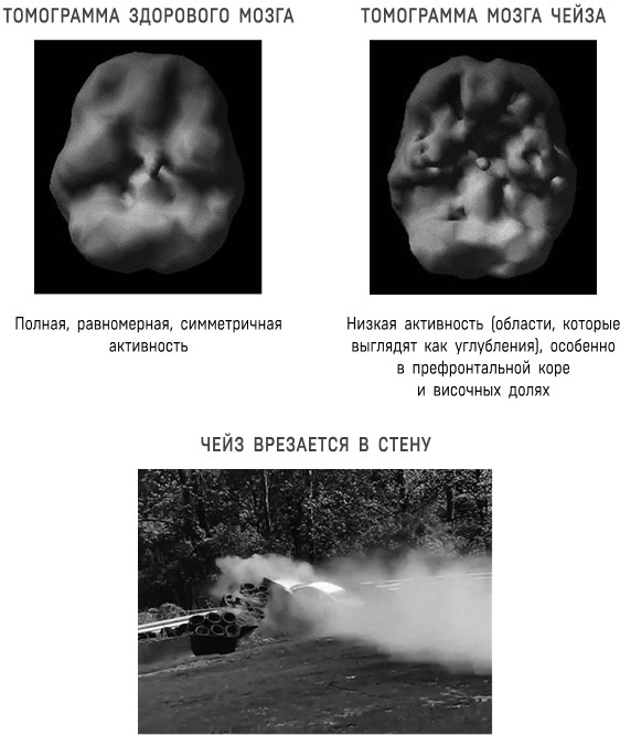 Результаты ОФЭКТ Чейза (см. иллюстрации на следующих страницах, где его томограммы сравниваются с томограммами здоровых людей) показали заметно низкий общий приток крови к его мозгу, особенно к префронтальной коре (область мозга, отвечающая за концентрацию внимания, просчет действий, суждения, планирование, эмпатию и контроль импульсов) и височным долям (область, отвечающая за стабильность настроения, обучение, память и контроль темперамента). Его томограмма вполне соответствовала полученной в прошлом травме головы и его недружелюбию, что заставило нас задать Чейзу конкретные вопросы, позволявшие понять, почему его мозг выглядел так неблагополучно.