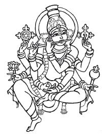 Вишну в восьмилепестковом лотосе. Вишну восседает в падмасане в сердце розового лотоса в саду небесного наслаждения. Он держит в руках цветок, раковину, сладкий лайм (матулунгу) и сакральный предмет. Во внешнем мире Вишну приходит как аватара. С внутренней стороны лепестков гигантского лотоса находятся Вараха, Нарасимха, Кришна, Даттатрея и другие. У земных воплощений по две руки, в которых они держат символы Вишну: чакру, лук, стрелу, флейту или булаву.