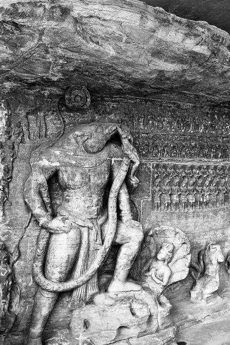 Слева: Вишну как могучий Вараха спасает Бхуми (мать Землю). Династия Чалукья стала первым семейством, принявшим Вараху как своего покровителя, в результате чего Вараха стал символом царской власти. Пещерные храмы Удаягири в Мадхья-Прадеш. Период Гуптов, 380–401 годы