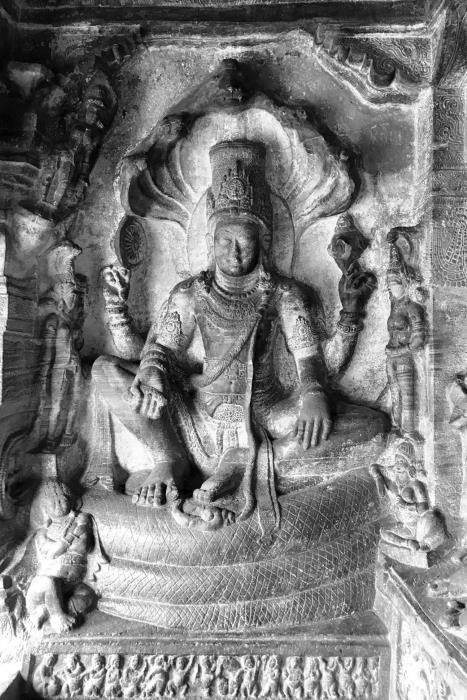 Слева: Вишну, сидящий под капюшонами Шеши.