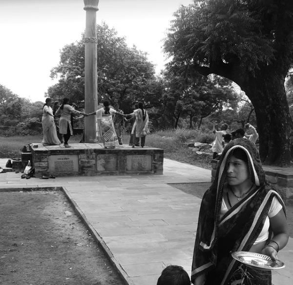 Под колонной надпись Археологического управления Индии: «Местные называли колонну Хамб Баба, ей поклонялись, преимущественно, рыболовы. Она содержит две надписи символами брахми на пракрите. Одна из них гласит, что колонна с Гарудой установлена в честь Бога Васудевы (Вишну) Гелиодором, греческим жителем Таксилы, прибывшим ко двору Бхагабхадры, царя Центральной Индии, как посол царя Антиалкида, индо-бактрийского царя Пенджаба. Гелиодор очевидно принял индуизм, поскольку он заявляет о себе как о бхагавате, то есть последователе вайшнавской традиции. Приблизительная дата колонны – 150 лет до н. э.»