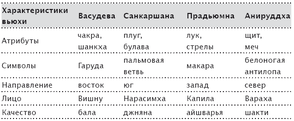 Во избежание противоречий, с которыми столкнулись почитатели Кришны, панчаратрики нуждались в гармоничном объяснении, как герои соотносятся с Вишну. Все божественные личности были объявлены эманациями, или вьюхами, Вишну. Позже Самба выбыл из списка, в результате чего «панча-вира» превратилась в «чатур-вьюху» (catur-vyūhas, или четыре вьюхи). Развитие идеи четырех вьюх имело далеко идущие последствия. Каждая из них получила собственную символику и ритуалы поклонения (табл. 2). Считалось, что последовательно вьюхи проявляют себя одна за другой: из Васудевы рождается Санкаршана и т. д. Идеологически четыре вьюхи отражали четыре цели земной жизни, четыре образа жизни (ашрама), четыре главные касты и пр.