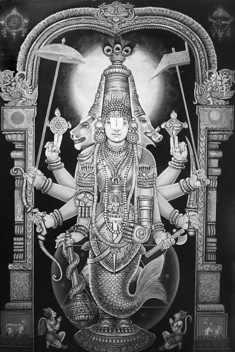 Слева: Вира-мурти Вишну, воплощение доблести и мужества. В нём соединены аватары Вишну, в которых прослеживаются идеи чатур-вьюхи. Слева от лица Вишну-Венкатешвары виден защитник Нарасимха, справа – спаситель Вараха, снизу – хвост Матсьи. Своим обликом он благословляет на преодоление жизненных препятствий. Современный постер из Тирупати