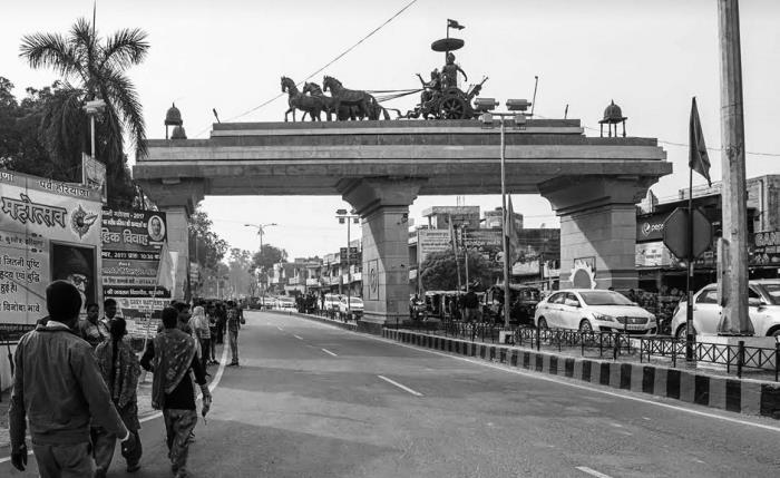 Курукшетра. Городские ворота при въезде, которые венчает колесница Арджуны с возничим Кришной