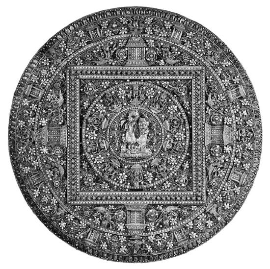 Мандала с Вишну. В центре мандалы – четырехрукий Вишну с супругой Лакшми, вокруг них десять сура-сундари (небесных красавиц) и беседки, утопающие в пышных садах Вайкунтхи. Они сложены из золота, горного хрусталя, жемчуга, граната, бирюзы, кораллов и аметиста. Как окно в мир Вишну, мандала служит для медитации на его цветущую вечность.