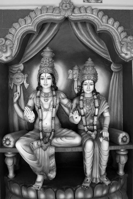 Слева: Вишну со своей супругой Лакшми в храме Нараяна-Тирумала в Шрикакуламе, Андхра-Прадеш