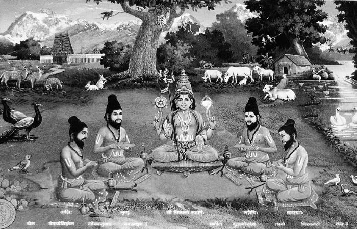 В Южной Индии ничего подобного «Махабхарате» не было. Эпос представлял собой энциклопедию жизни, сюжеты которой посеяли семена вайшнавской культуры в земле тамилов. Однако произведение не оказалось в необжитом пространстве. На юге уже почитали тамильских богов и богинь, прежде всего, Муругана и Котравей. На свой манер тамилы называли Вишну «Тирумалем» (Tirumal) – «восхитительного цвета синего сапфира, кого сопровождает победа, на чьём флаге развевается птица [Гаруда] в небесной выси» («Пуранануру», стих 56). В отличие от ведийского духа, пронизанного суровостью, доктринальностью и патетикой, тамильское почитание богов и богинь носило глубоко интимный и семейный характер. Для прибывших ведийских брахманов Вишну был совершенным сознанием и бесконечным принципом, которому приносят жертвы, передаваемые богом огня Агни куда-то на небеса. Местные же воспринимали его как близкого и родного человека, которого кормят из рук и рядом с которым получают облегчение от невзгод. «Я обещаю коснуться стоп Тирумаля, на чей гороподобной груди восседает [супруга] Тирумакаль», – говорили тамилы. Взаимоотношения преданных с Тирумалем носили романтический характер.