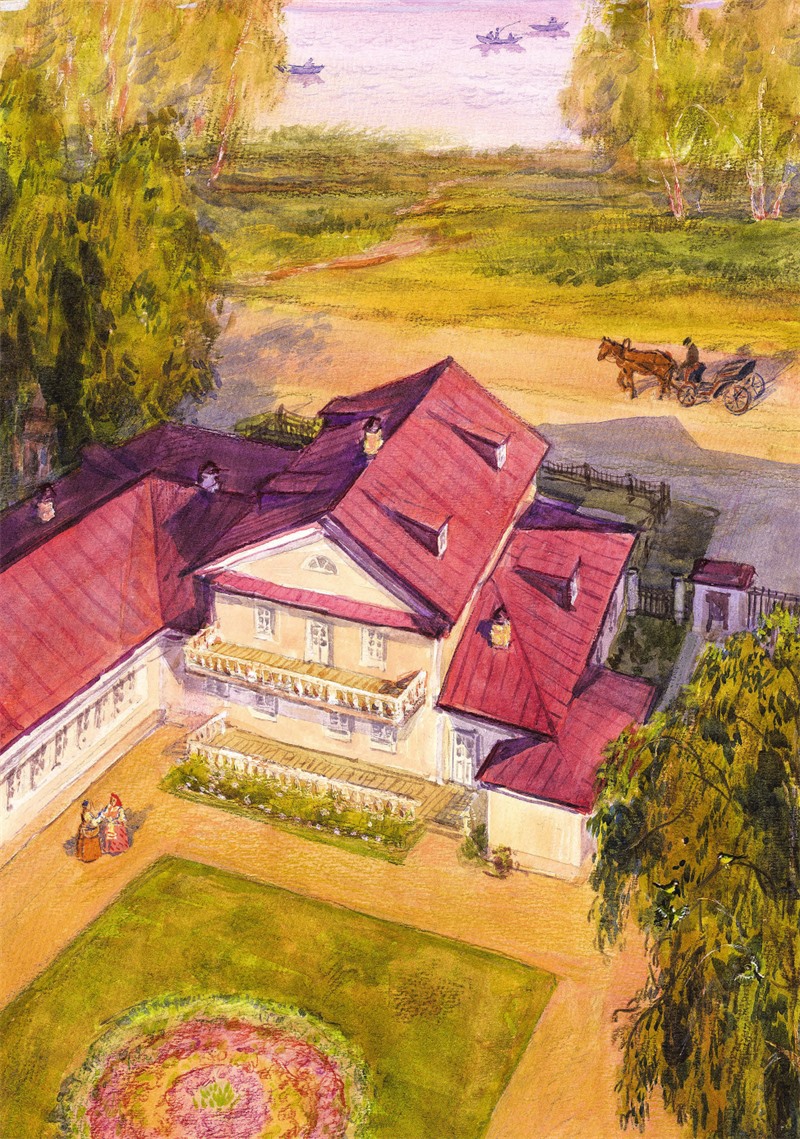 На первом этаже дома девять комнат. В низеньком втором этаже – мезонине – комнат всего две, здесь разместились детские. В большое полукруглое окно спальни ребята любят смотреть на пруд. Этот красавец представляется им настоящим морем! На его волнах вечерами качаются лодки рыбаков. В ожидании клёва мужики поют песни, а потом один за другим достают из воды рыбу. На противоположном берегу виднеется бескрайний лес.