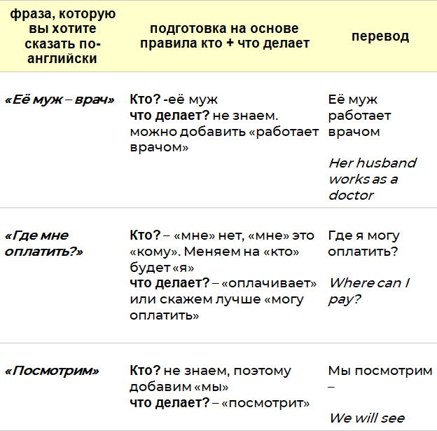 Вам сейчас важно понять принцип доведения своей фразы до Кто (Что)+ что делает. Не пугайтесь новых слов в таблице. Просто посмотрите, как ваш мозг должен перестраивать русские идеи на английский манер по принципу Кто (Что) + что делает
