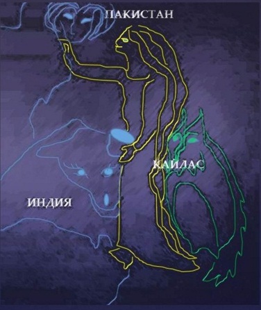 Деву окружает Лев с человеческим лицом, как стоящего у пирамиды Хеопса, Телец в виде лежащей коровы на рельефе Индии. В руках она держит Чашу Ориона, из которой поит Льва, передаёт знания. За спиной у неё сидит Сова, символ Тартарии. Это созвездия космического пространства. Дева есть бессмертная Мария, она молится о Мире. Орион даёт волну сияния. Там живут три князя – три звезды пояса созвездия, там Трон неба, сотканный из звёзд, там Ариев мир. На самой горе Кайлас выбили текст: «Ценная, красивая звезда Венера висит – солнца бессмертная дочь. Вытравлена. Прекрасный лик на плите. Сообщение миру – коды воина Вары (ковчега). Свили в Аркаиме солнце Ра. Вращался предсказанный не по оси, шел в дом летающий диск. Исса зашил Агни (Огонь) головёшкой». Над горой Кайлас, в ночном небе, горит свет в виде огненного коловрата. Сияние происходит от напряжённого труда Великих Душ Учителей на благо человечества. Этот огонь поместил в гору Иисус. И летающие диски, как говорит надпись, у него есть.