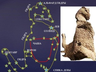 Его спина – линии созвездия Гидры. Хвост образуется из линий созвездия Центавр (Кентавр), на животе расположено созвездие Чаша, в лапах дракончик держит наше Солнце в созвездии Льва (июль месяц). На верхушке головы дракона находится звезда Альфард – оранжевый уединённый гигант. В космическом пространстве под лапами дракона есть Чёрные Дыры. Чёрная дыра под животом дракона соответствует созвездию Ворон, от которого идёт прямая линия к звезде Спика созвездия Дева на мегалите и на звёздном глобусе. Каменные отростки под хвостом дракона соответствуют скоплениям звёзд в Центавре. Человечеству оставлена не просто скульптура дракона, а копия скопления космической материи, собранной в тело дракона.