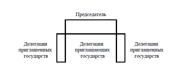 На столах раскладываются бумага и письменные принадлежности. В соответствии с международной практикой во время заседаний делегации размещаются в порядке алфавита против часовой стрелки. За столом располагаются: руководитель делегации, справа – определённое им должностное лицо, за ним – остальные члены официальной делегации.