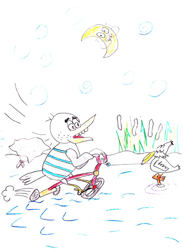 Бурун и Морковкин разжали крылья велосипедиста на руле трехколесного транспортного средства, Лиса подхватила удочку-причудочку. Плот качнулся и помчался по Спящему Озеру.