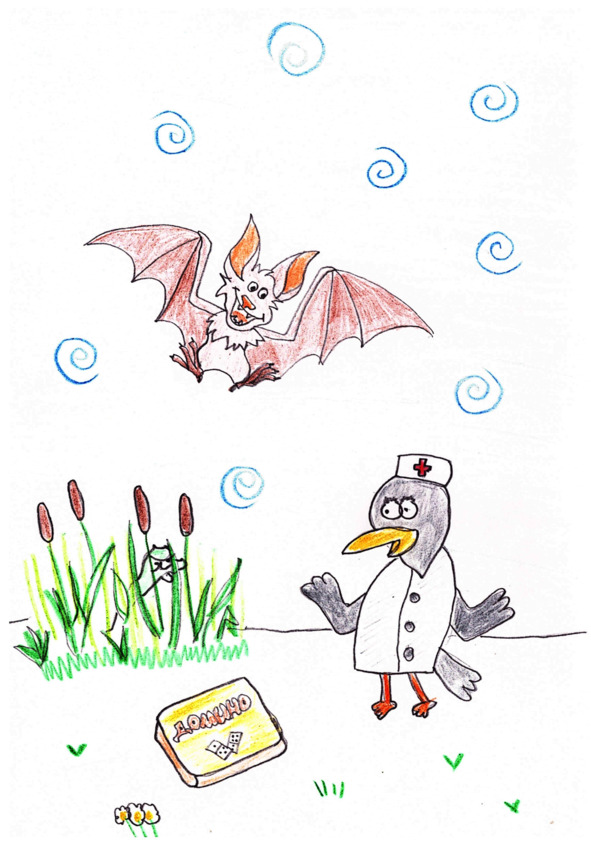 Дядюшка Грач с тревогой посмотрел на Луну, хотел было взлететь, но тут на его плечо приземлилась Летучая Мышь.
