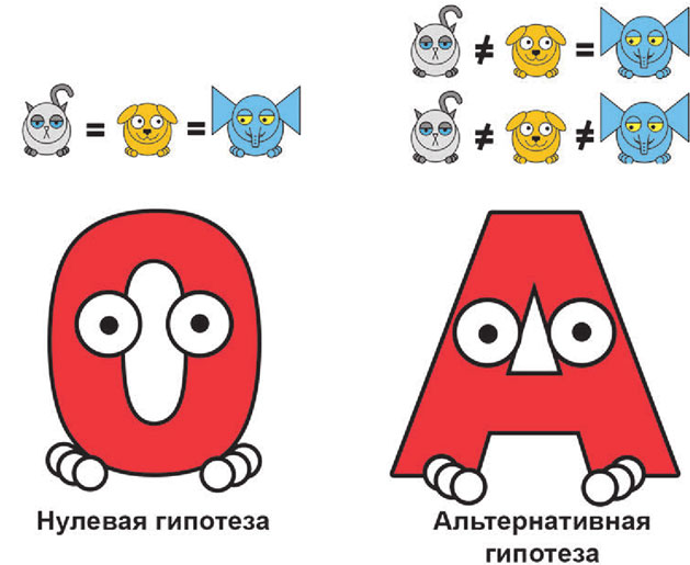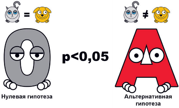 Если p-уровень значимости меньше 5 % (чаще записывается как 0,05), то нулевая гипотеза отвергается и принимается гипотеза о том, что котики и песики все-таки различаются. Такая гипотеза называется альтернативной.