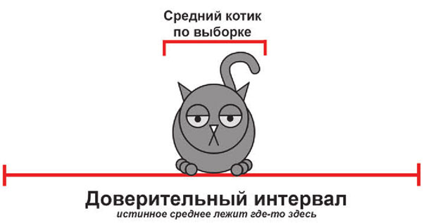 Доверительные интервалы. Как уже было сказано ранее, ученые чаще всего проводят свои исследования не на всех котиках, а на какой-то выборке. Соответственно, они не знают истинного среднего размера по всем котикам. Однако они могут прикинуть, в каком диапазоне он находится. Такой диапазон называется доверительным интервалом.