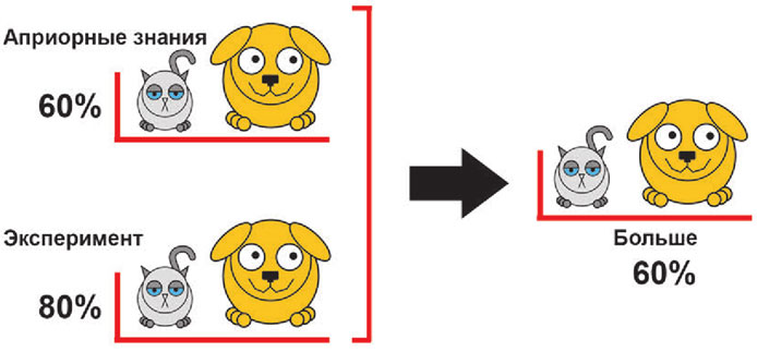 Не вдаваясь в математические подробности, опишем общую логику. Предположим, что из предыдущих опытов мы выяснили, что в 60 % случаев случайно выбранный песик больше случайно выбранного котика. Проведя собственный эксперимент, мы обнаружили, что это число гораздо выше – 80 %. Следует ли из этого, что нам нужно забыть наш предыдущий опыт и заменить старые данные новыми? Разумеется нет. Новый опыт только подправит предыдущую вероятность, и в следующий раз мы будем считать, что она несколько выше.