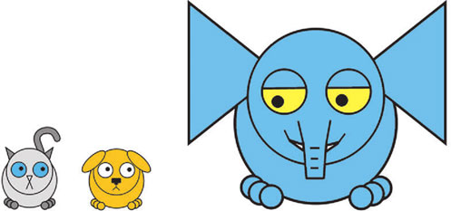 Однако отметим, что котики, песики и слоники по отдельности также бывают весьма различными в зависимости от возраста, генов и режима питания. Теоретически мы можем встретить как очень большого котика, так и весьма маленького слоника.