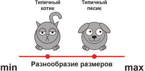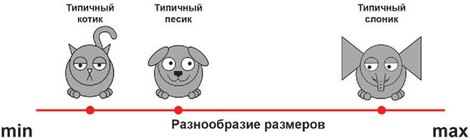 Во-первых, давайте объединим котиков, песиков и слоников вместе и отметим их общее разнообразие. Мы можем заметить, что размеры их типичных представителей могут существенно различаться. Например, средний слоник намного больше среднего котика.