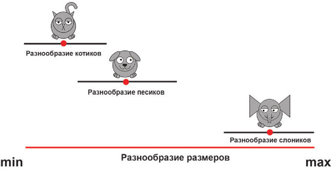 Теперь предположим, что мы убрали отсюда всех слоников. Как вы можете заметить, разнообразие размеров сильно уменьшилось, поскольку слоники вносили в него существенный вклад. И чем сильнее типичные слоники отличались от остальных, тем больше был этот вклад.