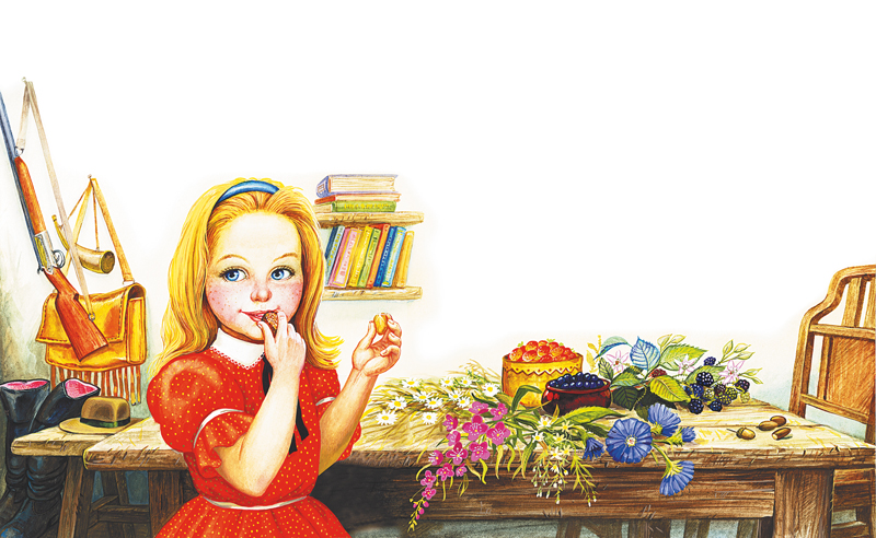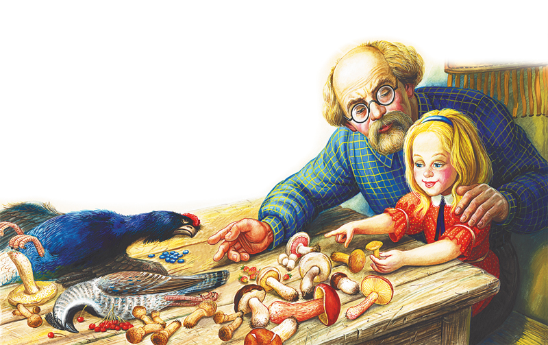 Ещё я высыпал на стол много белых грибов, и красных, и чёрных. Ещё у меня была в кармане кровавая ягодка костяника, и голубая черника, и красная брусника. Ещё я принёс с собой ароматный комочек сосновой смолы, дал понюхать девочке и сказал, что этой смолкой деревья лечатся.