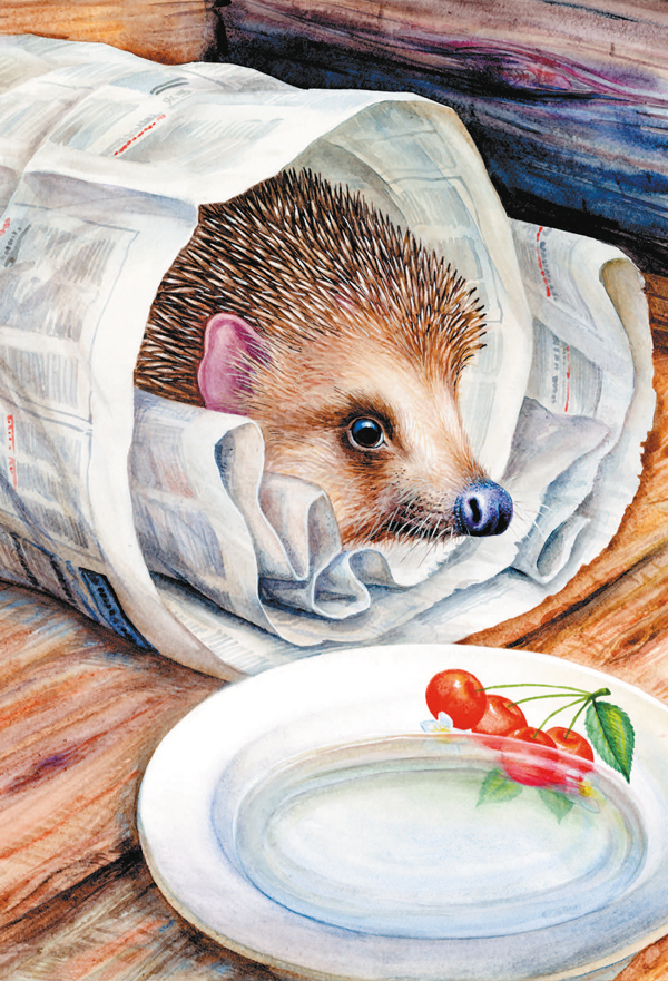 Сплю я всегда очень чутко. Слышу – какой-то шелест у меня в комнате. Чиркнул спичкой, зажёг свечу и только заметил, как ёж мелькнул под кровать. А газета лежала уже не возле стола, а посредине комнаты. Так я и оставил гореть свечу и сам не сплю, раздумывая: «Зачем это ёжику газета понадобилась?» Скоро мой жилец выбежал из-под кровати – и прямо к газете, завертелся возле неё, шумел, шумел и наконец ухитрился: надел себе как-то на колючки уголок газеты и потащил её, огромную, в угол.