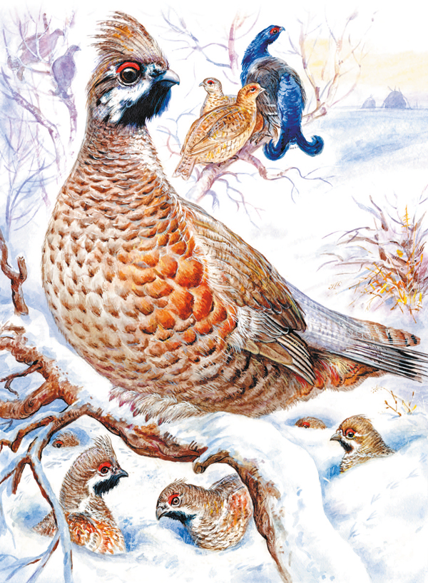 У рябчика в снегу два спасения: первое – это под снегом тепло ночевать, а второе – снег тащит с собой на землю с деревьев разные семечки на пищу рябчику. Под снегом рябчик ищет семечки, делает там ходы и окошечки вверх для воздуха. Идёшь иногда в лесу на лыжах, смотришь – показалась головка и спряталась: это рябчик. Даже и не два, а три спасения рябчику под снегом: и тепло, и пища, и спрятаться можно от ястреба.