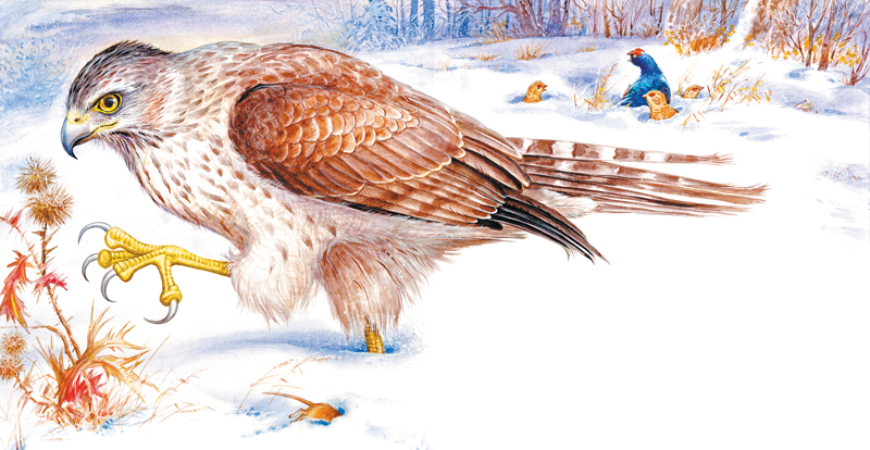 Тетерев, я считаю, много умнее куропатки. Раз было со мной в лесу: иду я на лыжах; день красный, хороший мороз. Открывается передо мной большая поляна, на поляне высокие берёзы, и на берёзах тетерева кормятся почками. Долго я любовался, но вдруг все тетерева бросились вниз и зарылись в снегу под берёзами. В тот же миг является ястреб, ударился на то место, где зарылись тетерева, и заходил. Ну вот прямо же над самыми тетеревами ходит, а догадаться не может копнуть ногой и схватить. Мне это было очень любопытно, думаю: «Ежели он ходит, значит – их чувствует под собой, и ум у ястреба велик, а такого нет, чтобы догадаться и копнуть лапой на какой-нибудь вершок-два в снегу, значит, это ему не дано».