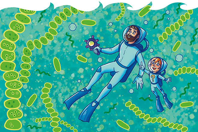 – Да, как без них. Бактерий в океане множество, но сегодня мы повидаемся только с одной их группой – цианобактериями. Прежде их называли сине-зелёными водорослями. Синезелёными – за цвет, а водорослями – за образ жизни. Они не только живут, как водоросли, в воде, но и их роль в природе похожа на ту, которую играют настоящие водоросли и растения суши. И цианобактерии, и водоросли умеют использовать энергию солнечного света, чтобы из углекислого газа и воды создавать органические вещества, такие как углеводы, а попросту говоря – сахара. Этот процесс называется фотосинтезом. Из образовавшихся веществ они строят свои тела-клетки, это нужно им, чтобы расти и размножаться. А побочным продуктом фотосинтеза становится газ кислород.