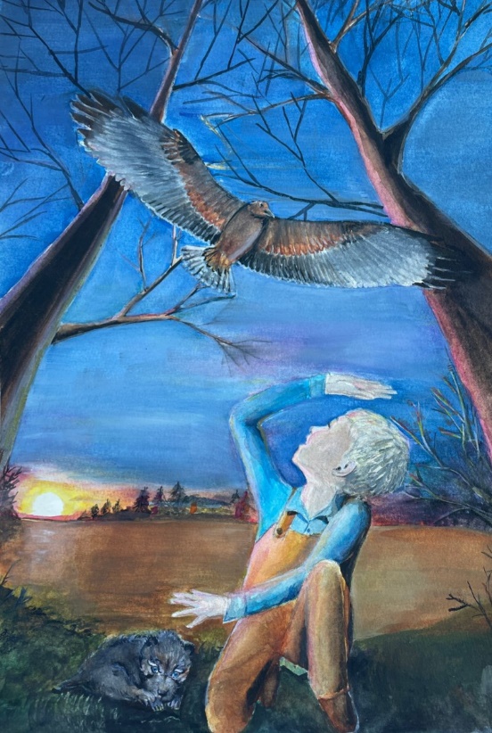 с криком пролетела прямо над ними, шумно размахивая при этом крыльями. Мальчик очень испугался, а волчонок сразу же инстинктивно припал всем туловищем к земле. "Просто так оставить его в лесу нельзя", – подумал мальчик. Тут ему в голову пришла мысль, которую он немедленно принялся воплощать в жизнь.