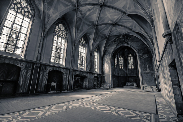 Говоря пару слов о нём, нельзя было не заметить огромные алые шторы, закрывающие невероятно высокие, почти панорамные окна с решётками, отчасти выполненные в качестве узоров, дополняя заострённые верхушки этих закрытых слоем стекла отверстий. Обои были еле различимы в тусклом свете огромным люстр и прочих источников освещения, изредка мерцая, но даже при этом условии можно было оценить дороговизну как обоев, так и прочих деталей декора. Две удлинённые лестницы, ведущие на второй этаж, который также был виден отсюда, были выполнены бесподобно с различными заострёнными частями.