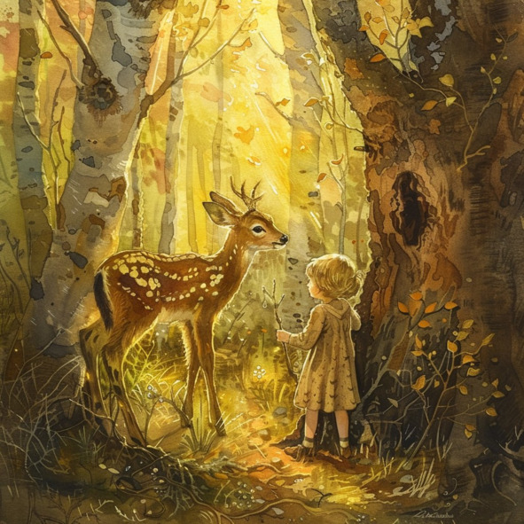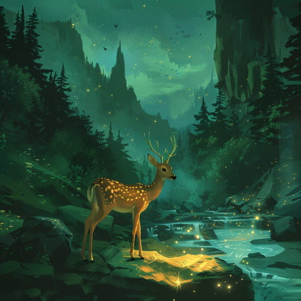 В краю, где вечно зеленели леса, укрытые от сильных ветров горами, жил-был волшебный олененок. Рожки его сияли золотом, а глаза светились чистым ручейком, отражая глубину лесной тайны.