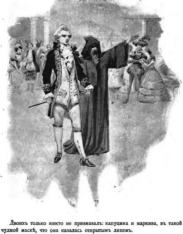 Зато товарищ его, капуцин, очень скоро привлёк всеобщее внимание. Он выказывал замечательное знание способностей, тайн, даже помыслов всех его окружавших. Он сделал несколько таких удачных замечаний, два-три предсказания присутствовавшим, до того метко их касавшихся, что громкие возгласы слышавших их привлекли целую толпу. Многие бросили танцы и ходили, заинтересованные странными незнакомцами, из комнаты в комнату, вслед за ними, слушая их, делая предположения, стараясь узнать капуцина по голосу, – но и голос его положительно был незнаком никому.
