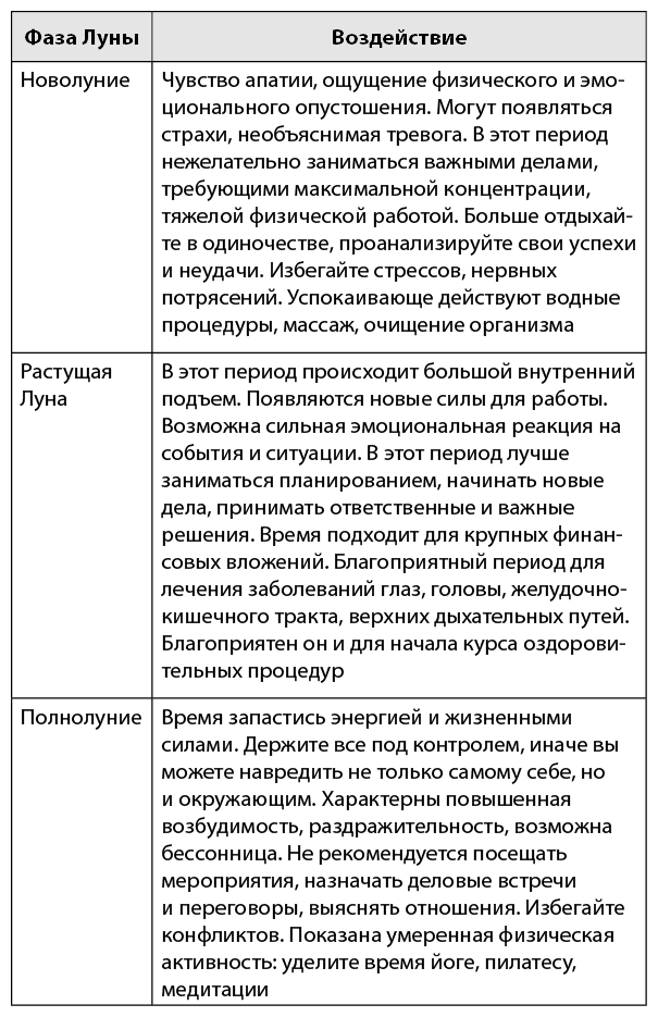 Кроме этого, в календаре содержится информация по поддержанию здоровья и хорошего самочувствия, даны советы по выбору физической нагрузки, рекомендации по питанию, народные приметы, связанные с Луной.