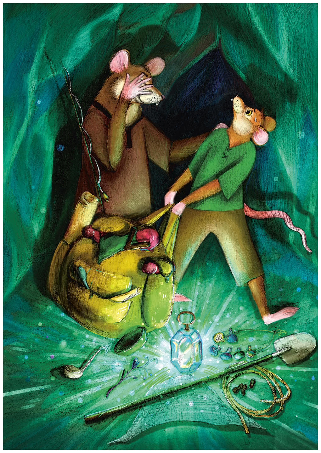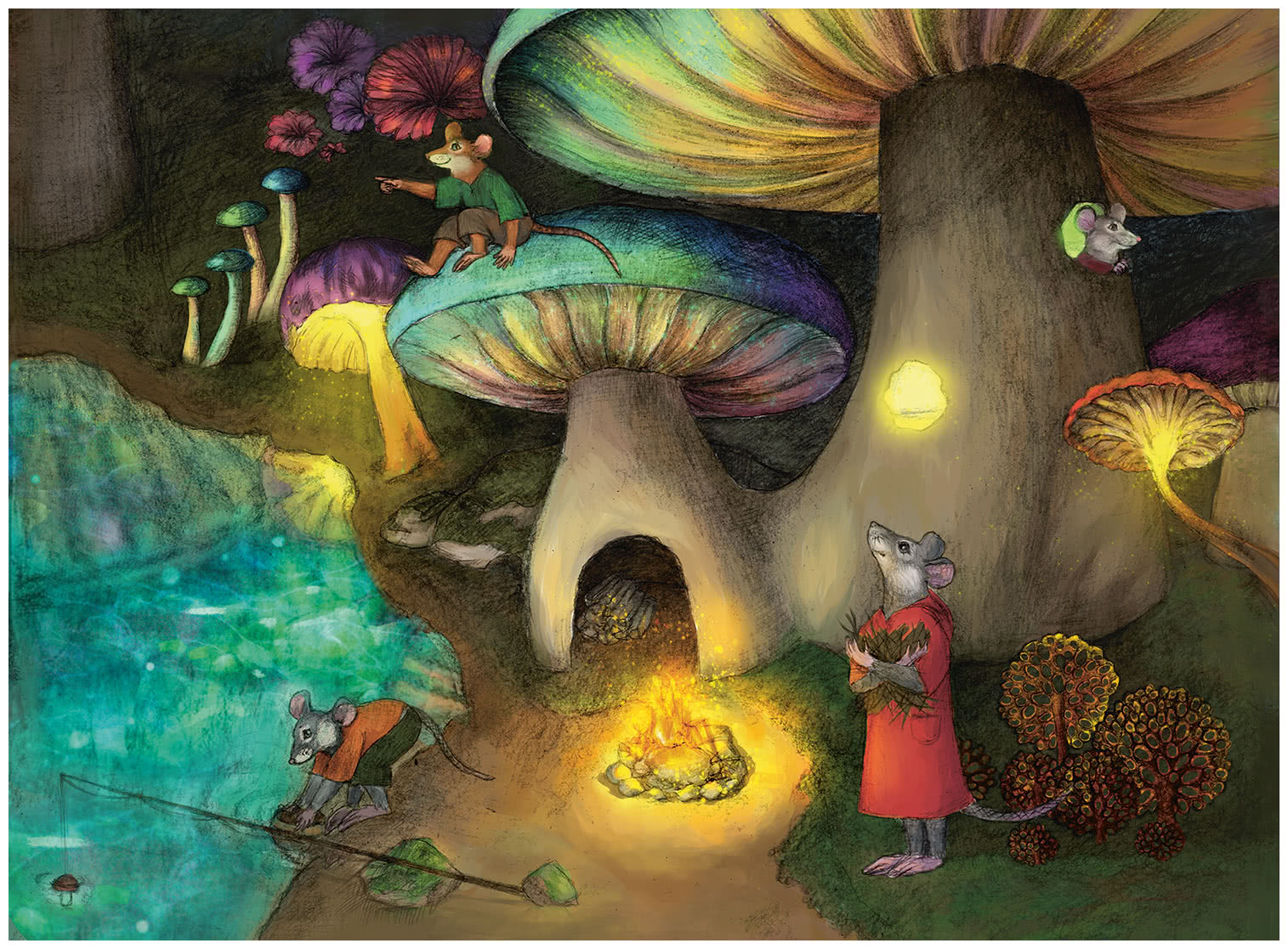 Команды мышат разбрелись по окрестностям, подыскивая себе местечко для обустройства лагеря. На самом берегу озера нам удалось найти отличный сросшийся гриб-гигант. В нём мы и обустроили своё жилище. Вместе мы сделали в нём отверстия, заменившие нам комнаты, и развели рядом с ним костёр. Наконец можно было немного отдохнуть. Я взобрался на шляпку нашего домика, желая насладиться прекрасным видом. Вдруг я заметил, что в нашу сторону плывут лодки с необычными существами, напоминавшими крупных ящеров. Это были скрипуны – озёрный народ, что жил поблизости и промышлял рыбной ловлей. Завтра нам предстояло сразиться с молодыми скрипунами в мастерстве рыбалки. Даже малыши этих ящеров искусно владели гарпунами, потому чаще всего именно они побеждали в соревнованиях, но иногда победу удавалось одержать и мышатам. Впрочем, никто никогда не расстраивался из-за проигрыша, ведь соревнования были всего лишь поводом для знакомства с другими подземными народами.