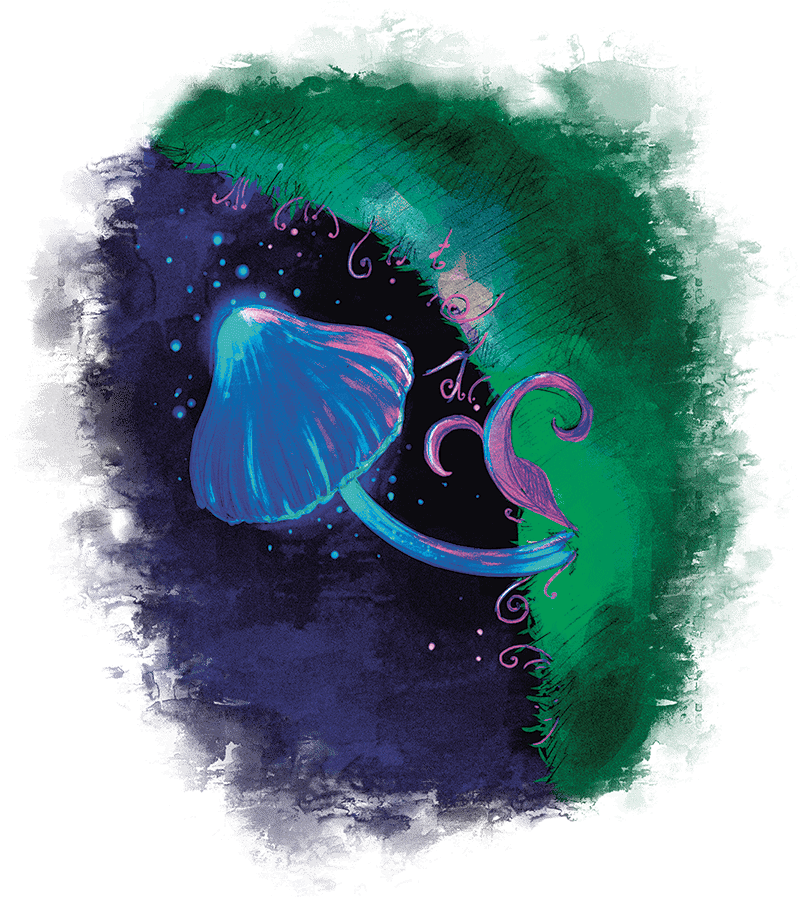 Куда же мы пришли? Я и не знал, что бывают настолько красивые, похожие на сказку места! Здесь, на дне глубокой обширной пещеры, располагалось большое подземное озеро. Сквозь кристально чистую воду виднелись светлокамни, сияющие всеми оттенками зеленовато-голубых тонов. На берегу, покрытом густым зелёным мхом, стоял чудный лес из гигантских грибов. Диковинные грибы были разных форм и цветов, а некоторые даже светились, отбрасывая вокруг себя яркие тени. Многие из грибов были такими огромными, что совершенно не годились в пищу, но могли послужить нам отличным укрытием, если вырубить внутри них полость. Грибная роща казалась настолько поразительной, что я был счастлив от того, что мне довелось увидеть всё это своими глазами.