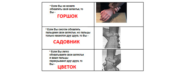 «Кистевой Тест» может считаться «экспресс-тестом» на определение психотипа, но недостаток его в том, что он не учитывает индивидуальные генетические особенности. Люди бывают «ширококостными» и «тонкокостными», а это вносит путаницу в определении психотипа, особые сложности возникают при определении психотипов «ГОРШОК или САДОВНИК», и «САДОВНИК или ЦВЕТОК» у женщин.