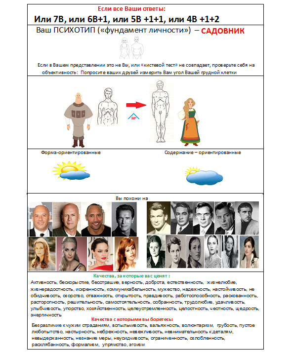 Из уважения к читателю я не буду подробно распространяться о том, что достоверность результатов теста, прежде всего, зависит от честности отвечающего перед самим собой. Просто еще раз уточню – тот, кем родился человек (ПСИХОТИП), это не обязательно тот, кем хотели бы видеть его родители, или тот, кем бы он хотел быть в своих глазах.