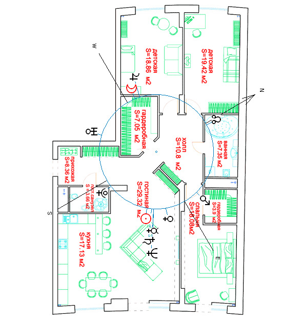 Рис. 011. Локально-пространственный гороскоп. Проекция на схему квартиры. Астрологическая программа «ZET 9 GEO»