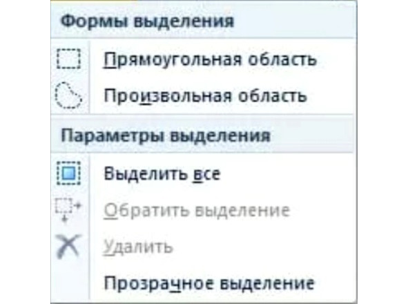3. Для выделения в «Paint» установите прозрачный режим. В Windows 10 это выглядит следующим образом: нажать на кнопку «Выделить», выпадет окошко, в котором необходимо выбрать опцию «Прозрачное выделение».