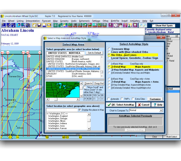 При выборе «Local Space» у вас есть возможность выбрать любую страну, континент или весь мир. Можно увеличивать или уменьшать масштаб, помещать определенный город или точку на карте в центр карты. Когда вы увеличиваете масштаб, «Kepler» автоматически размещает больше городов на карту. «Kepler» также может автоматически добавлять большее количество астрологических влияний при увеличении масштаба. Эти функции «автоматической настройки» позволяют вам быстро и легко получать необходимую информацию.