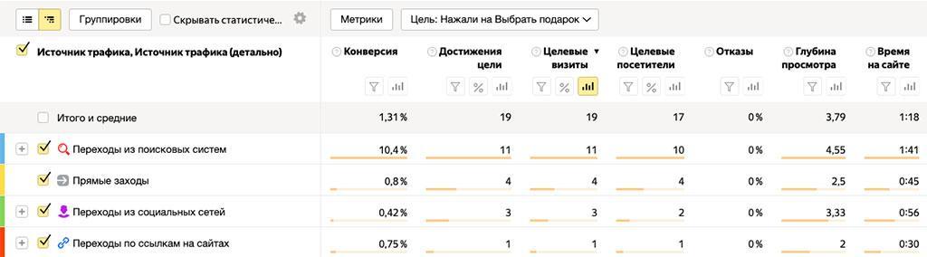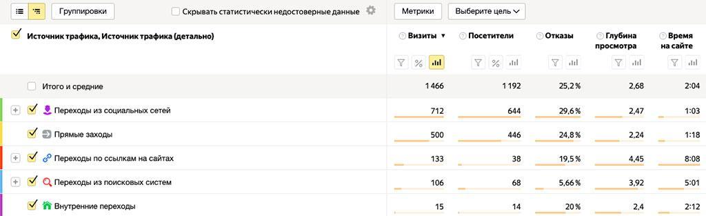 Пример отчета посещаемости сайта по источникам трафика в Яндекс.Метрике