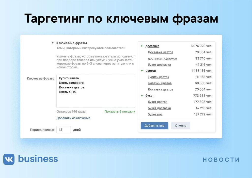 Кстати, в момент написания этой главы ВКонтакте выпустил еще одно новое шикарное обновление рекламного кабинета – таргетинг по ключевым словам, аудитория по которым будет собираться из поисковых запросов ВКонтакте, доски объявлений «Юла», Одноклассников, главной Mail.ru и других проектов холдинга: