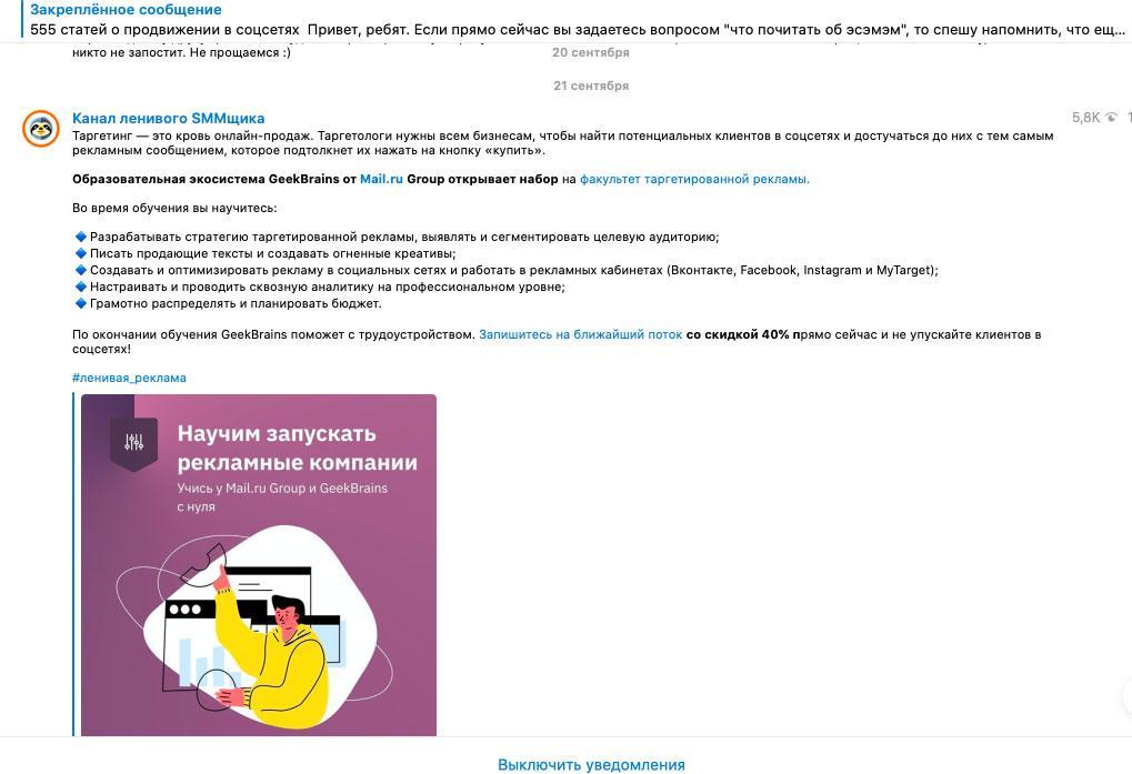 Реклама образовательной платформы GeekBrains в телеграм-канале Саши Чижова, «ленивого SMM-щика»