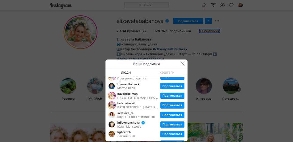 3. Посмотрите, на кого подписаны блогеры, – скорее всего, они могут быть подписаны на таких же лидеров мнений в своей нише. Например, популярный женский коуч и психолог Елизавета Бабанова подписана на других коучей: