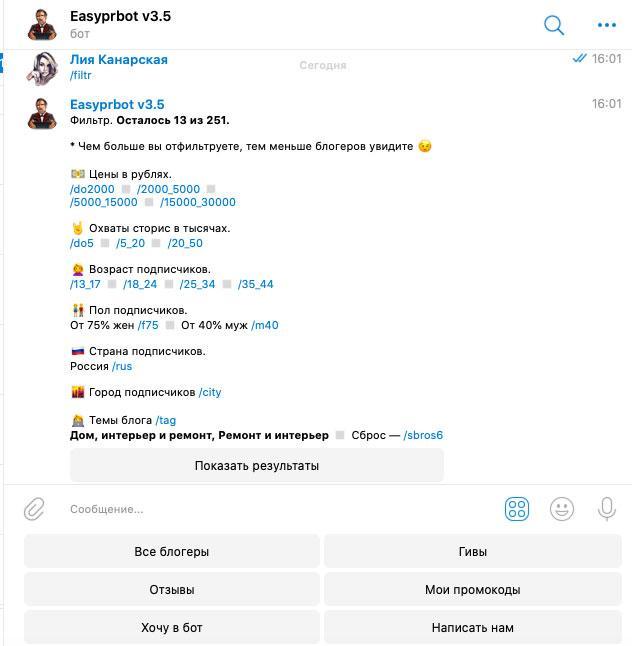 6. Поиск в биржах блогеров или в телеграм-каналах. Из самых известных на рынке блогеров это: GetBlogger, EPICSTARS, LabelUp, StoriesGain. В Телеграме пока что из известных для подбора инстаграм*-блогеров чат «Бережок» от Ольги Берек и @easyprbot. Главное преимущество – возможность фильтрации для более точного поиска инфлюенсеров. Например, по охватам, тематике, числу подписчиков: