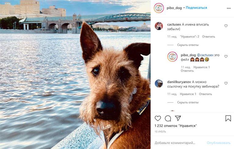 Вот пример поста аккаунта @pibo_dog, который посвящен воспитанию и дрессировке собак. В посте с итогами конкурса ребята допустили ошибки и честно признали это. Но зато они раздали скидки на популярный курс всем подписчикам, а после публиковали бесплатные материалы на темы, которые вызвали больше всего вопросов. Обратите внимание, потенциальные покупатели сразу начали писать под постом