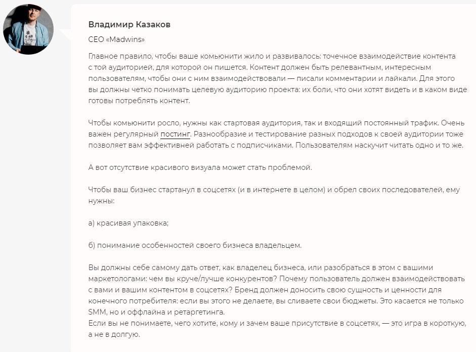 Делать все это можно как самостоятельно, так и при помощи комьюнити-менеджера. Главное при этом – транслировать ценности бренда, сохранять его голос и управлять вашей аудиторией. В какой-то момент вы/специалист превратитесь и в личного психолога, который прекрасно знает свою аудиторию и знает, что ей нужно. Пользователь должен знать, что вы всегда рядом и готовы помочь, ответить или подарить эмоции.